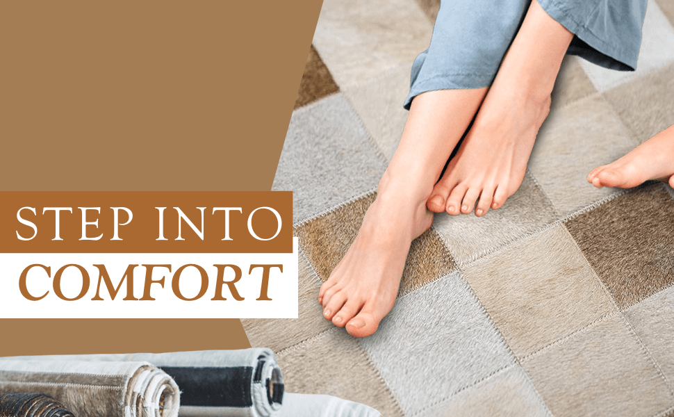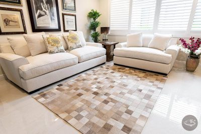 Our Beige Gradient Patch Cowhide Rug – Squares Design can be customized to any size to perfectly suit your space.