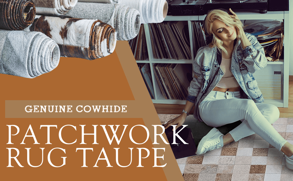 100% Genuine Cowhide Patchwork Rug – Taupe-Champagne, Mosaic Squares Design, Modern Animal Hide Rugs for Living Room, Office or Kitchen Area – Decorative Indoor Carpet