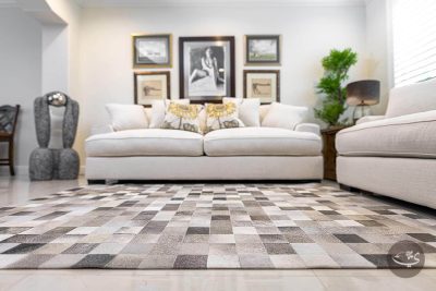 Our Beige Gradient Patch Cowhide Rug – Squares Design can be customized to any size to perfectly suit your space.